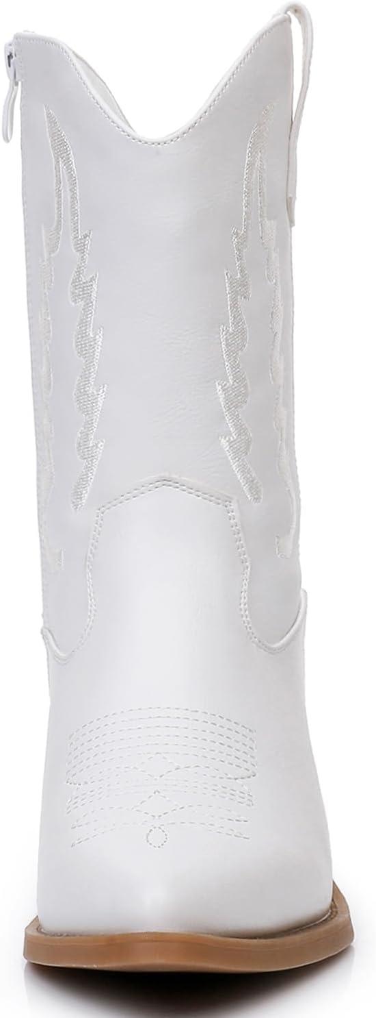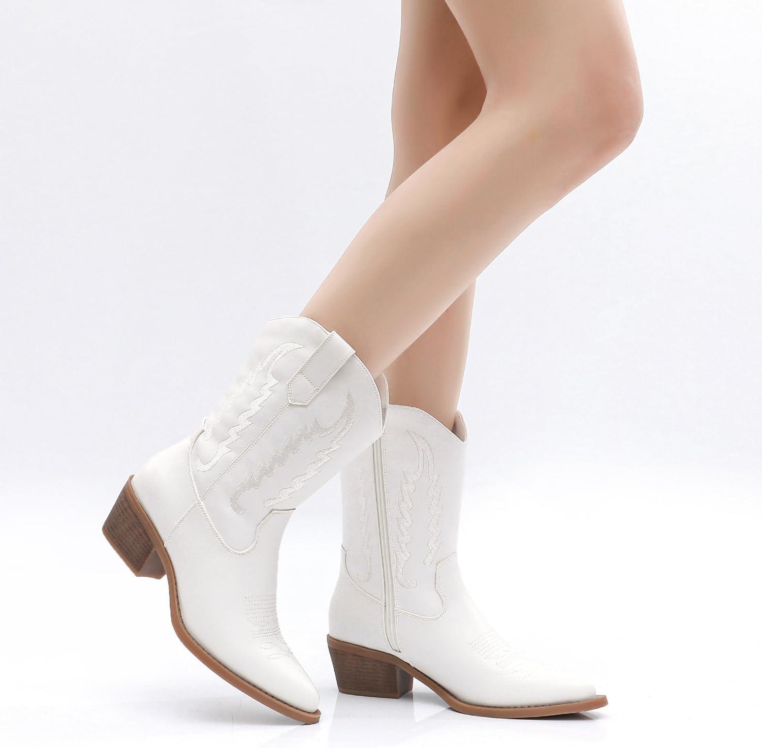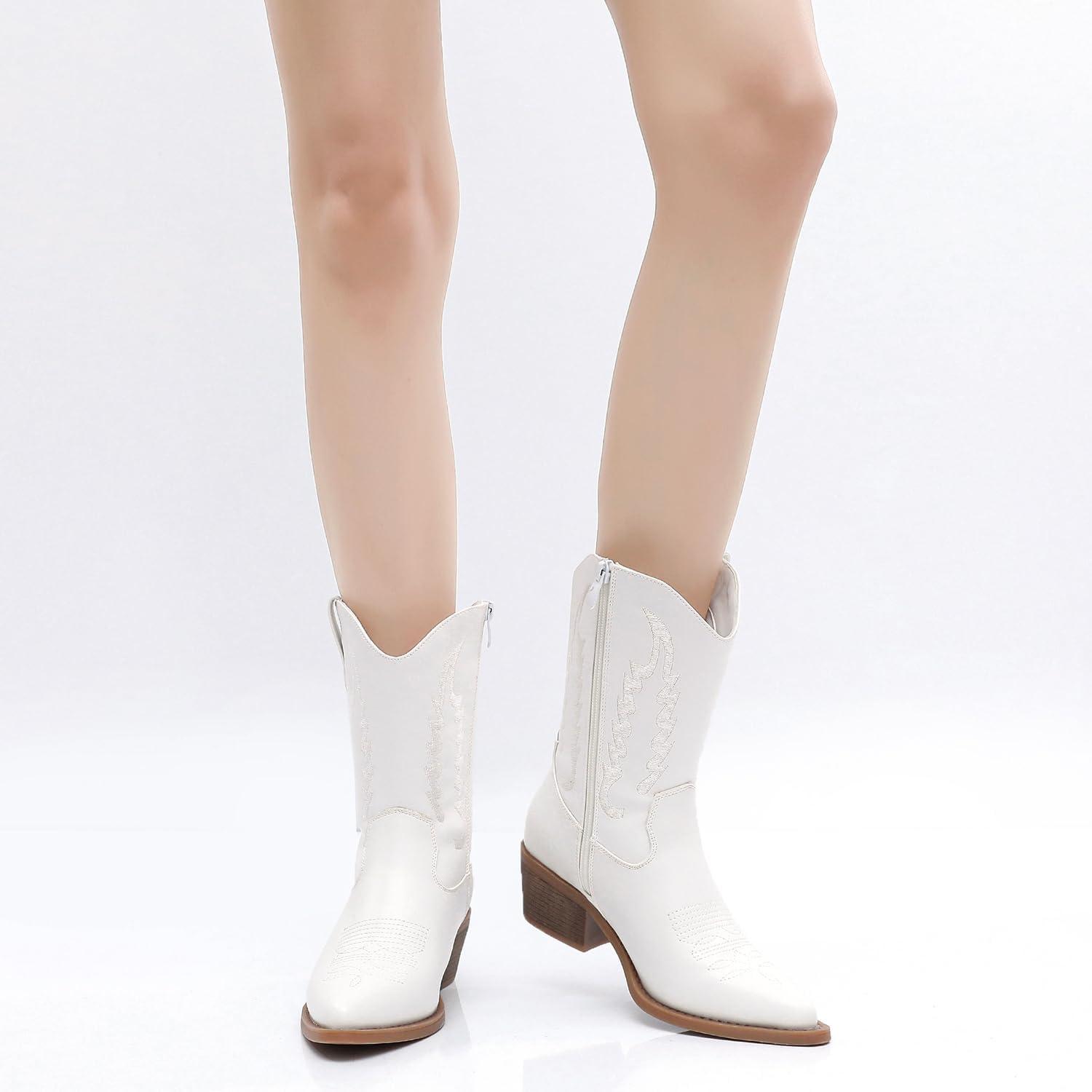 GLOBALWIN Women’s Cowgirl Boots Mid Calf Western Cowboy Boots For Women Comfortable Low Heel With Zipper(23yy09 White)