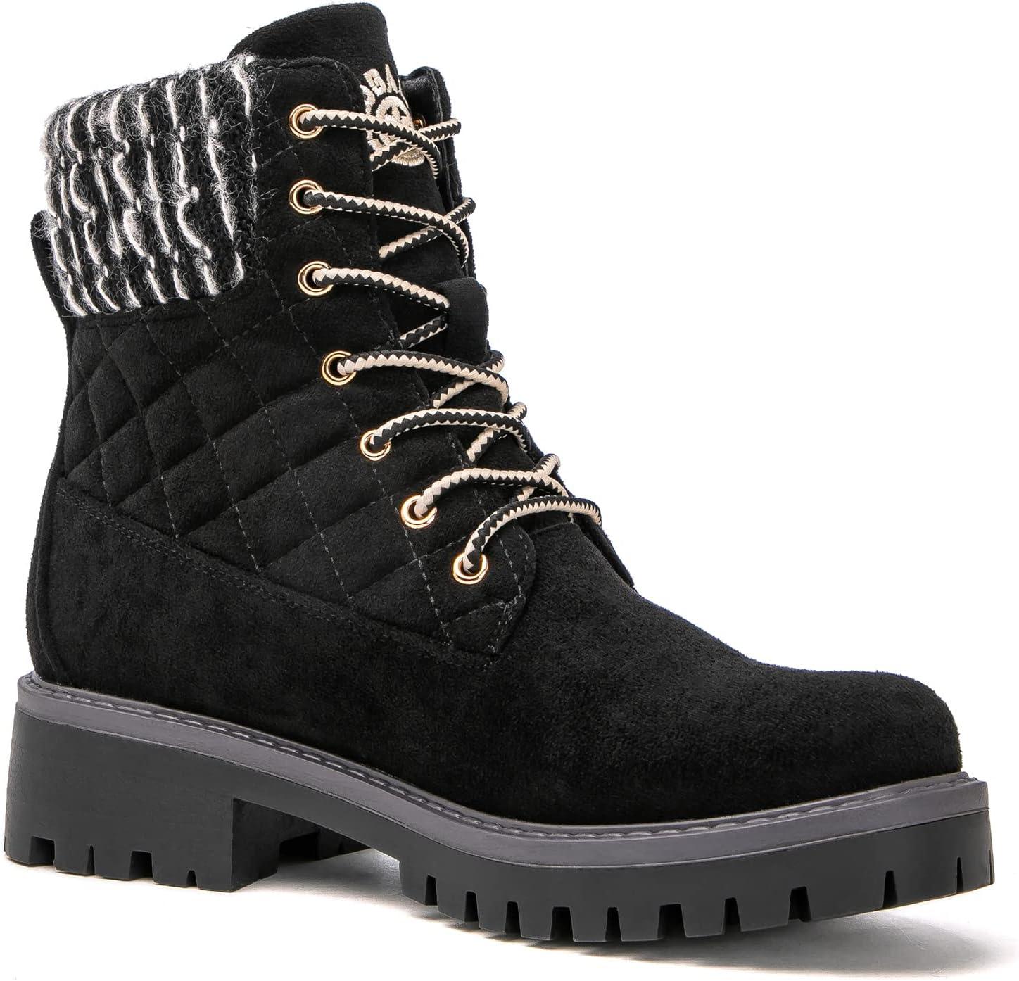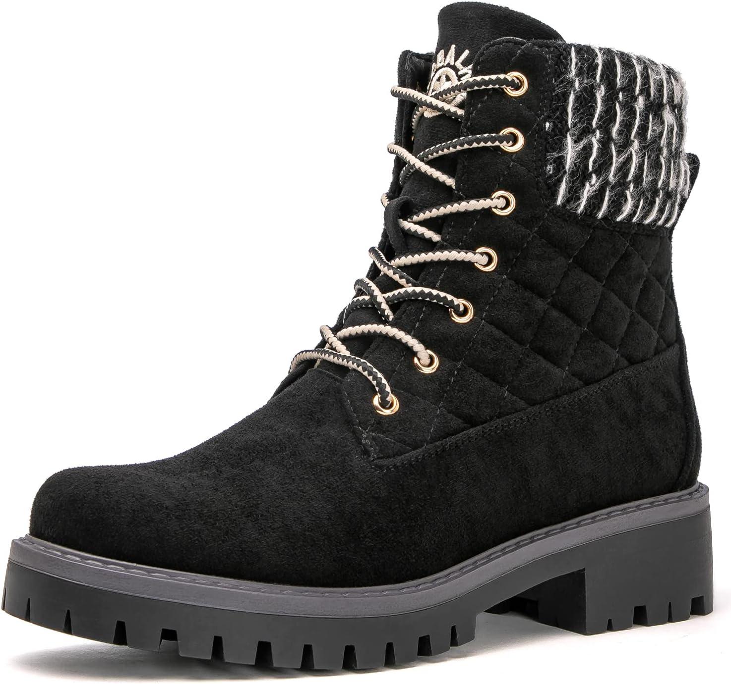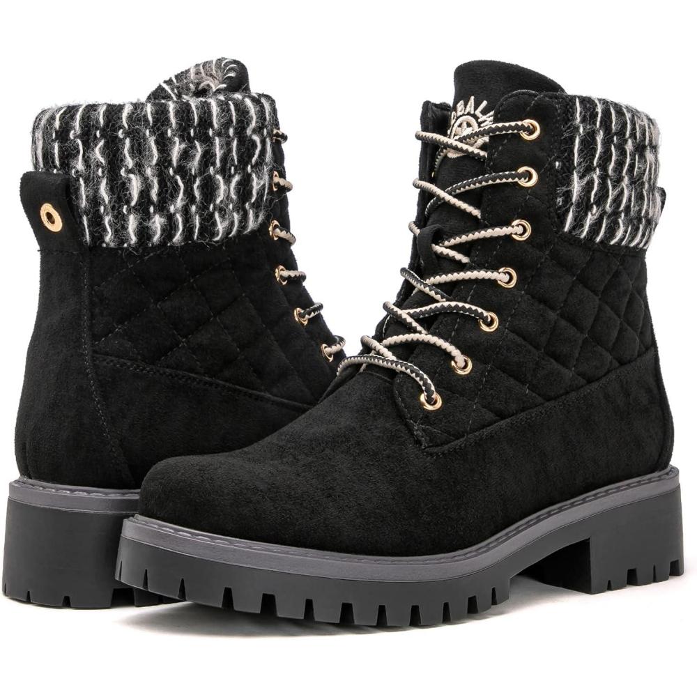 GLOBALWIN Women’s Quilted Ankle Boots Fashion Combat Boots Lace Up Combat Boots Low Heel Warm Fur Ankle Booties For Women(1915black)